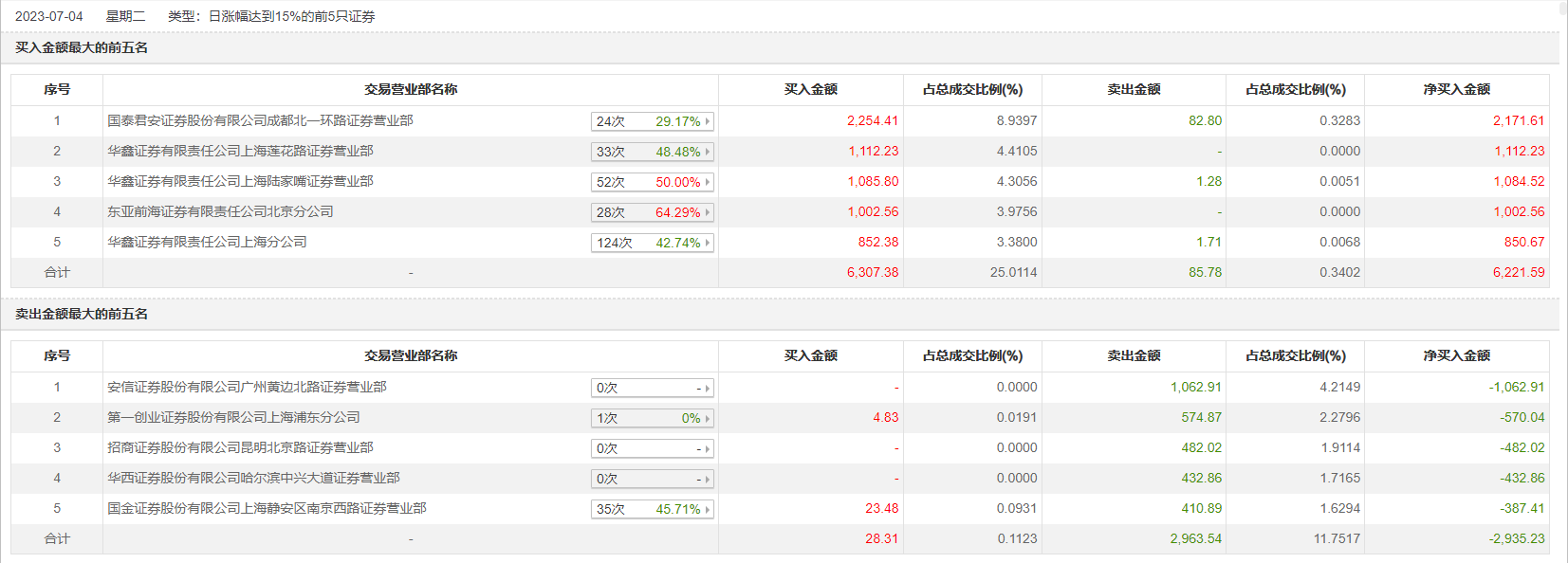 具体来看,国泰君安证券成都北一环路证券营业部、华鑫证券上海莲花路证券营业部分别买入2254.41万元、1112.23万元;安信证券广州黄边北路证券营业部、第一创业证券上海浦东分公司分别卖出1062.91万元、574.87万元。