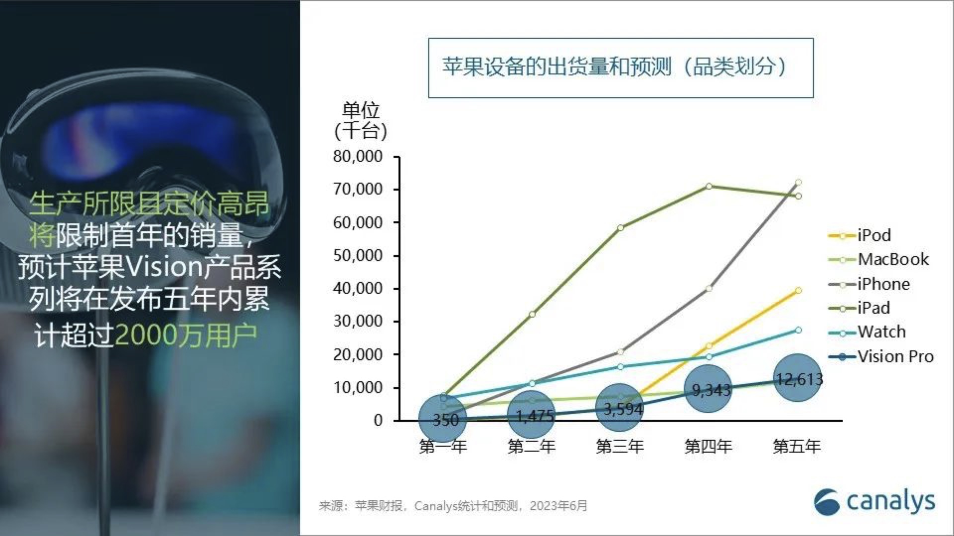 7月5日,市场调研机构Canalys最新报告预测,自2024年产品发布后,到第五年,Vision Pro及其相关系列的用户群体将达到2000万。苹果将通过Vision Pro再次证明,入市较晚并不是走向成功的障碍。苹果证明其已经充分了解下一代用户的需求和期望。到第五年年底,2000万Vision系列用户将约达到MacBook装机量的15%,而仅占iPhone装机量的2%。