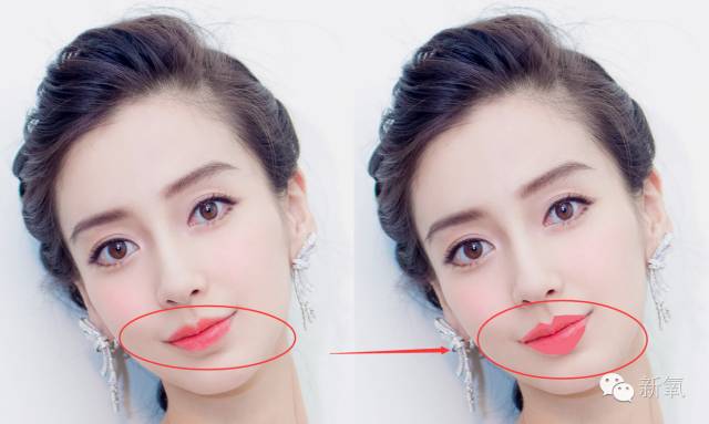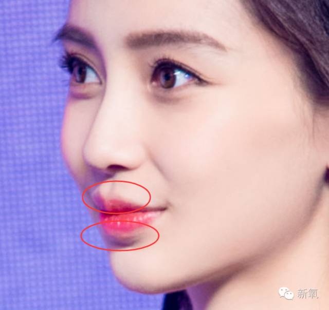 放大她的嘴唇,有一部分嘴唇用遮瑕盖住了的。