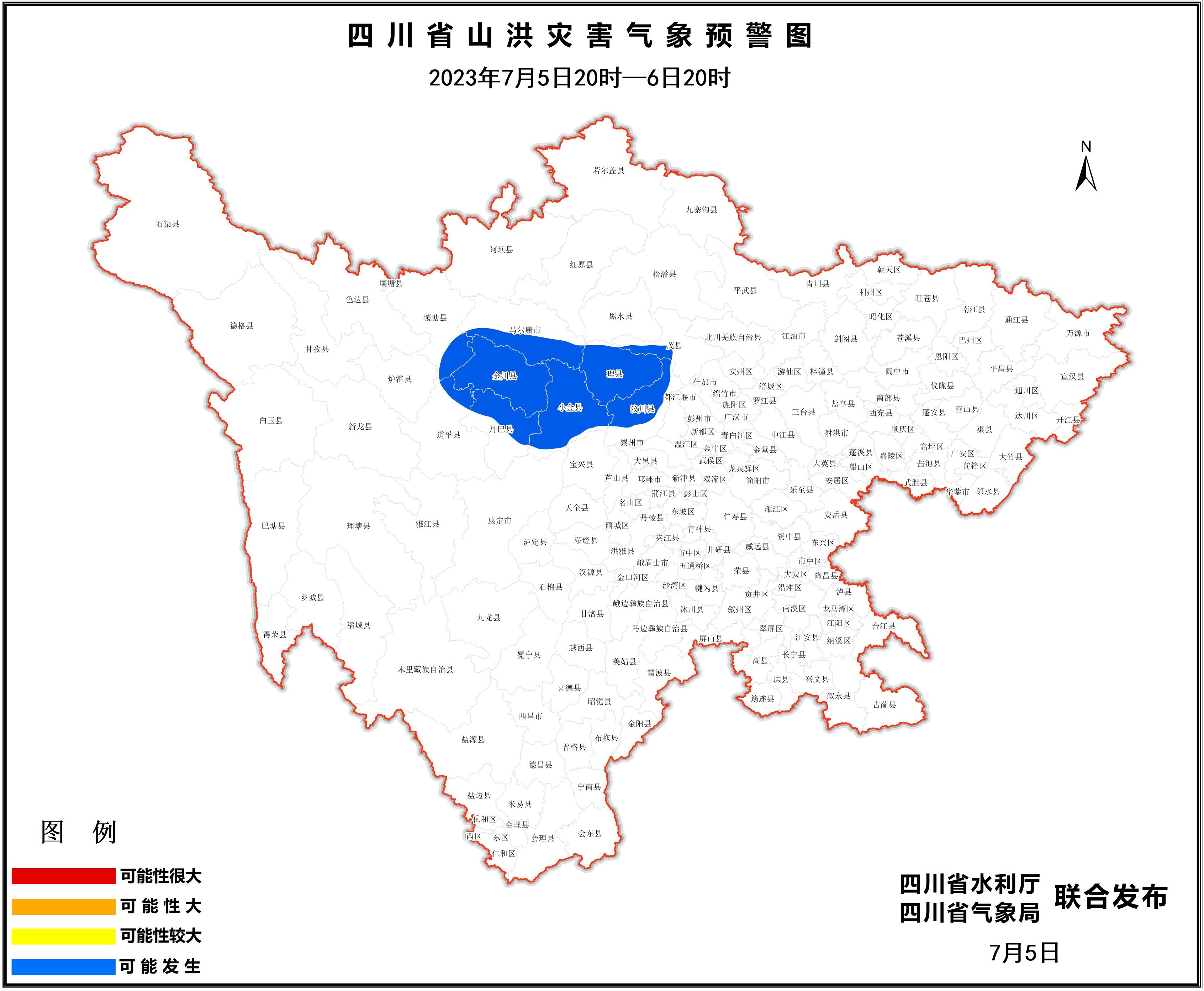 据四川省水利厅消息,2023 年 7 月 5 日 20 时至 6 日 20 时,阿坝州汶川、理县、茂县、金川、小金、马尔康、壤塘,甘孜州丹巴、道孚等 9个县(市)可能发生山洪灾害。