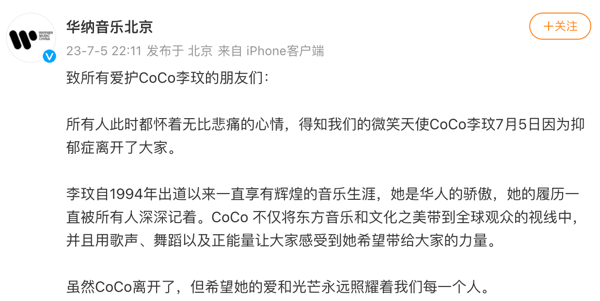 7月5日,歌手李玟去世,@华纳音乐北京 发文悼念:所有人此时都怀着无比悲痛的心情,得知我们的微笑天使CoCo李玟7月5日因为抑郁症离开了大家。李玟自1994年出道以来一直享有辉煌的音乐生涯,她是华人的骄傲,她的履历一直被所有人深深记着。CoCo 不仅将东方音乐和文化之美带到全球观众的视线中,并且用歌声、舞蹈以及正能量让大家感受到她希望带给大家的力量。虽然CoCo离开了,但希望她的爱和光芒永远照耀着我们每一个人。