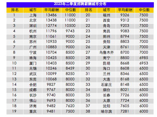 智联招聘周三发布的2023年二季度《中国企业招聘薪酬报告》显示,二季度全国平均招聘薪酬为10266元/月,较一季度的10101元/月环比上升1.6%,比去年同期下降0.7%。从地区来看,全国38个核心城市中,上海薪酬继续居首。