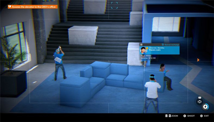 游戏渐入后期,将会有一个需要你骇入一艘火箭飞船的任务,这样你就可以紧接着破解一些卫星。不过你将闯入的并非是政府机构,而是一家名为“Galilei Corporation”的私人公司。这家公司有着极大的野心,并和科技界联系颇深。公司内部的墙壁上贴着许多设计精美、鼓舞人心的海报,为了不让外界对这家公司的业务知根知底,里面还内置了许多安保激光。