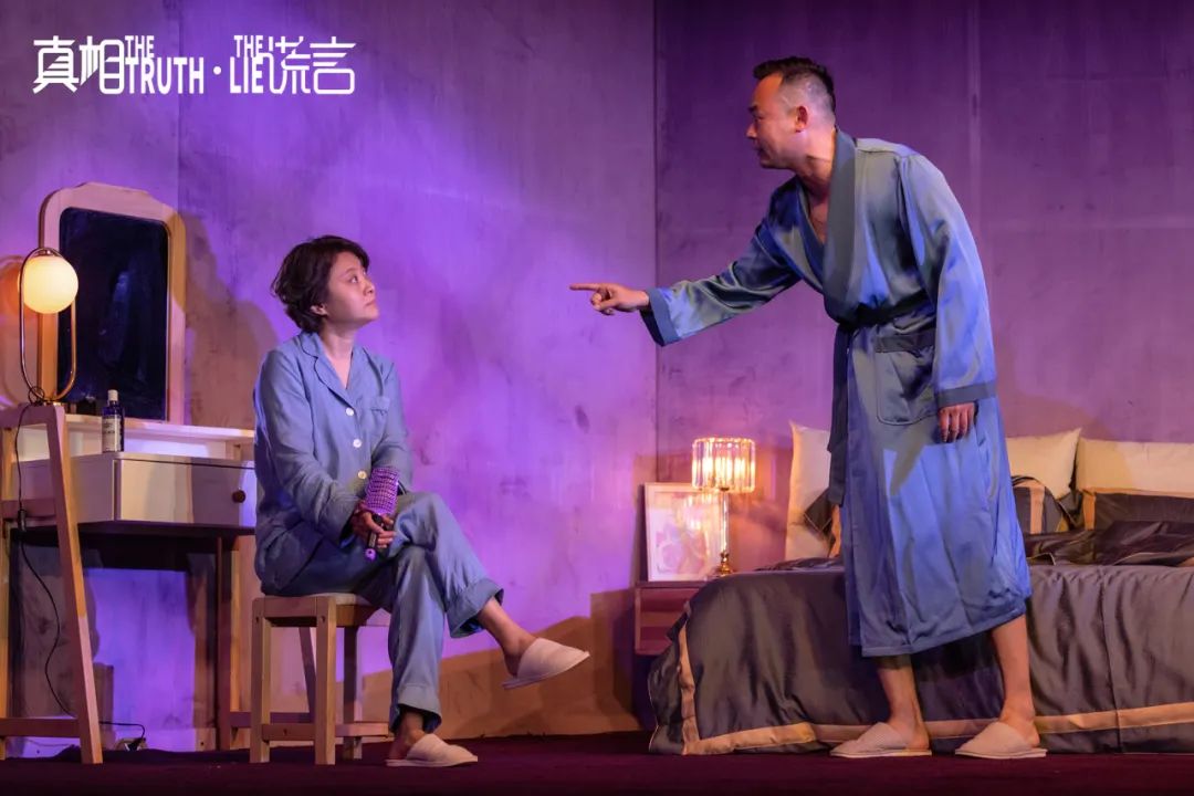 《真相》与《谎言》中的角色相同,但却是两个可以独立观看的故事。剧中有两对夫妻,彼此也是朋友。在这四人的复杂关系中,谎言交织在一起,让人难以看清真相。也令观众思忖,出于爱的谎言是否必要,坦诚是否是爱的证明?本轮《真相》《谎言》的舞美用转台的方式来呈现不同的场景。在《真相》的前三场,演员将连续进入三个房间,躺在三张床上,与两个不同的女人进行交流,转台的流动性使之成为一个有趣的动线画面。在空间布置上也尽可能还原了真实的家居环境。