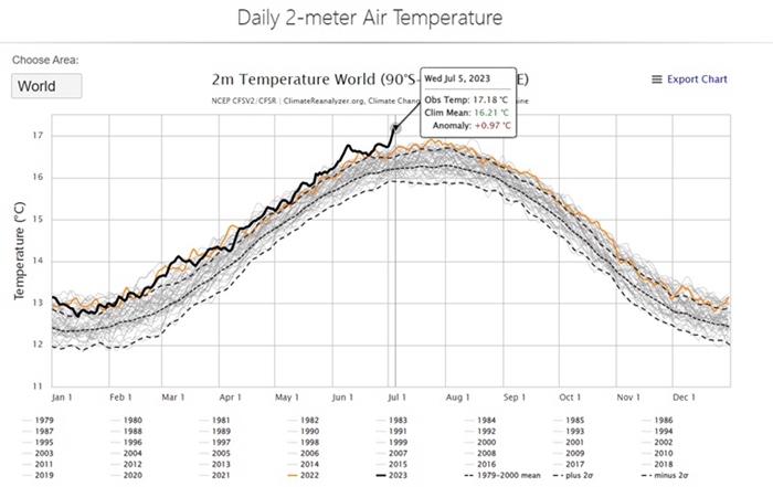 美国国家环境预测中心周二曾宣布7月3日成为有记录以来地球最热一天。当天全球平均气温为17.01℃,此前的最高纪录是2016年8月的16.92℃。