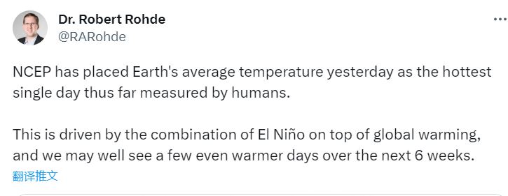 欧盟哥白尼气候变化服务局也确认,周一和周二的全球气温创下了该机构1940年有记录以来最高。英国帝国理工学院格兰瑟姆研究所气候科学家塞皮(Paulo Ceppi)认为本周的数据显示,地球“至少12.5万年”以来没有像现在这样热。