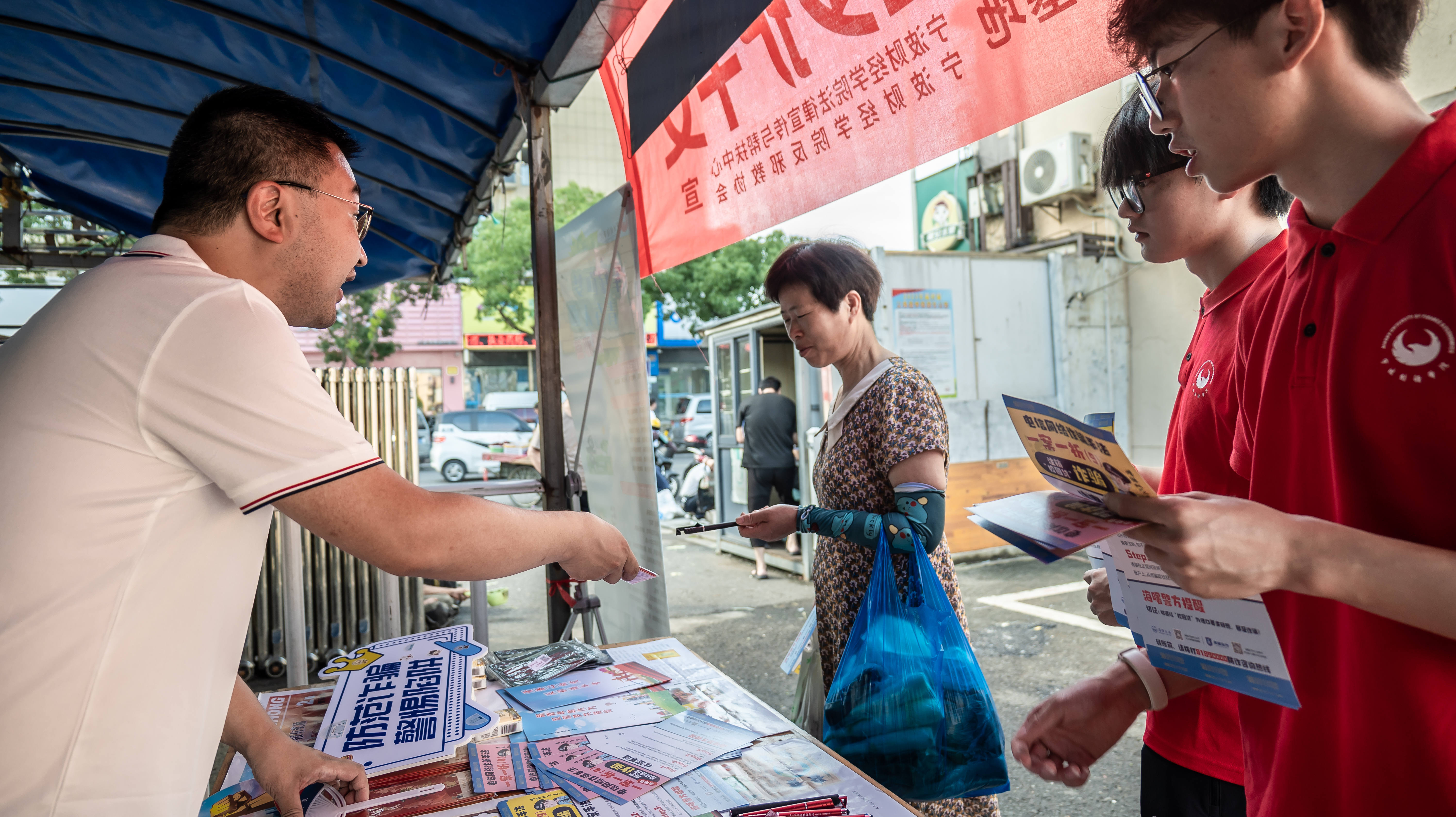 支起简易宣传台,拉起专题红横幅,变身“流动宣讲员”……近日,宁波高桥镇来了一支由宁波财经学院大学生组成的反邪教反诈骗社会实践团队,他们用绘声绘色的案例、生动形象的情景演绎,提醒广大群众警惕邪教和诈骗侵害,捂好自己和家人的“钱袋子”,得到了当地居民的一致点赞。