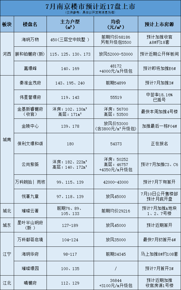 除此之外,预计还将有超15盘入市,大校场在7月依旧热火朝天,“出货量”排名第一,其次河西、江宁等都有纯新盘入市,也有一些老盘加推的计划。