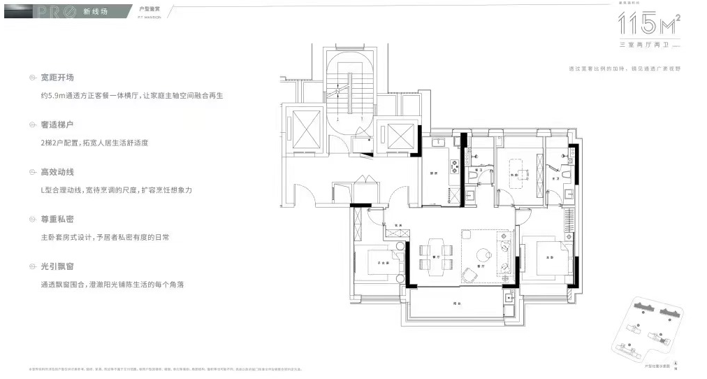 根据规划,项目共打造5栋17层小高层,打造建面约115㎡(三房)、130㎡(三房)、173㎡(四房)三种科技系统户型,全一梯一户式入户。