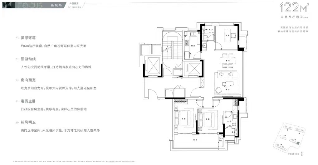 边厅设计,边厅飘窗面宽约6米,南向双卧、双阳台,主卧套房设计。