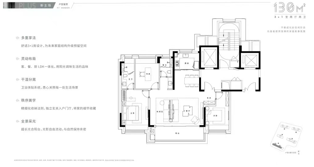 3+1房设计,+1房可与客厅打通,提升客厅空间感,亦可用作书房,提升空间功能性。