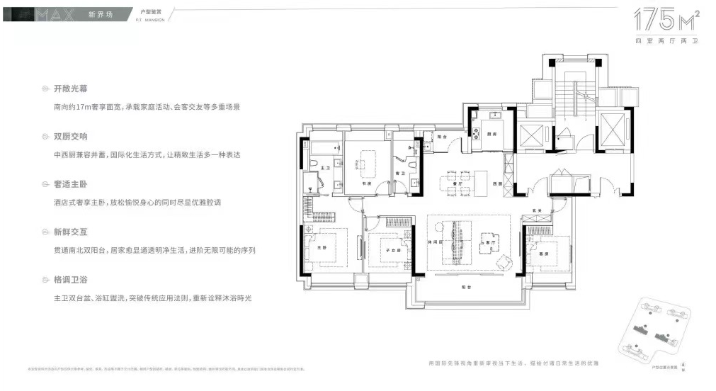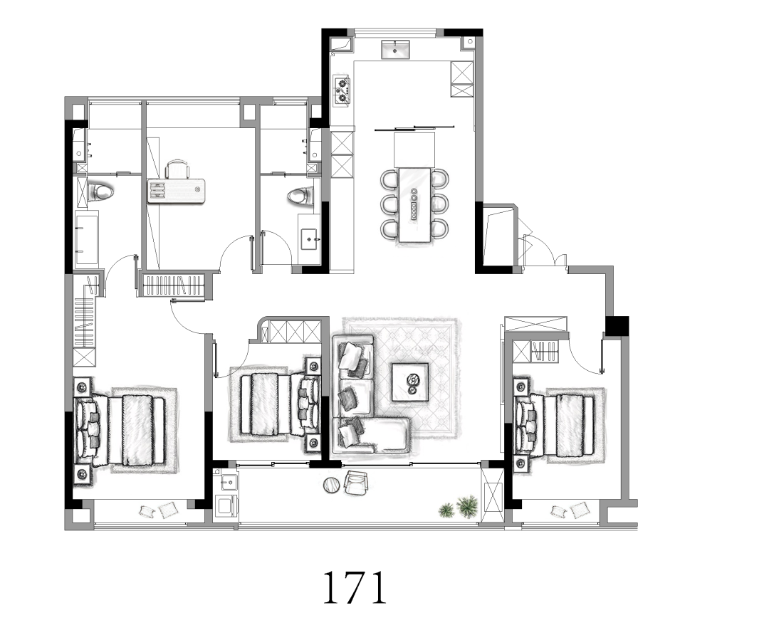 其中建面171㎡户型为主力户型,四房两厅两卫,三开间朝南,客餐厅一体,南北通透,每个房间均带有飘窗。