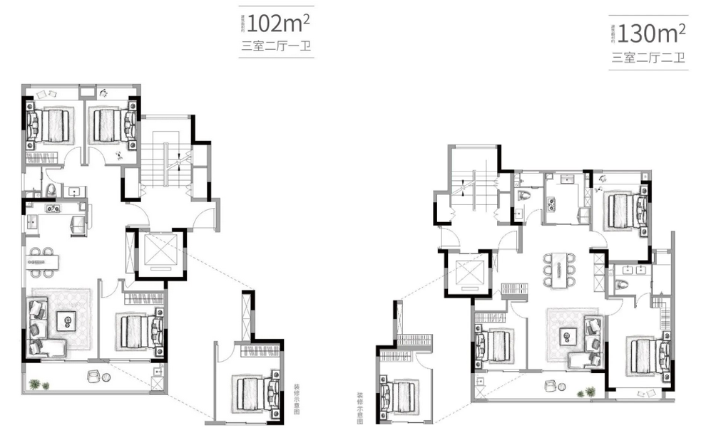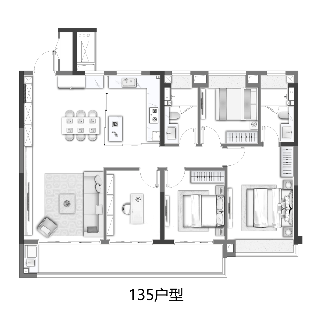 户型方面,项目主力100㎡、135㎡户型,适合刚改首置人群上车;此外在户型规划上,两户型均是三房起步,并都带了两个卫生间,更好地保护好每一个人的隐私空间。