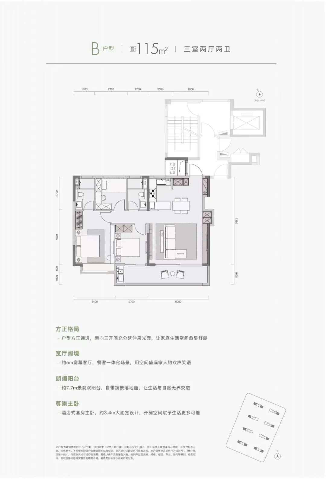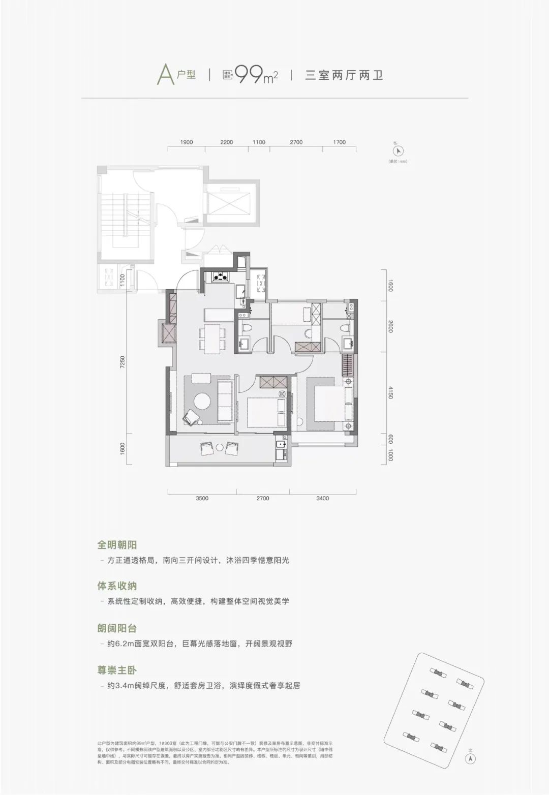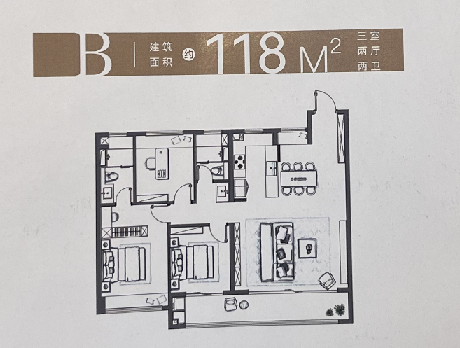 是该项目的起步户型,三开间朝南、约6.2米双阳台设计,约3.4米宽奢横厅,空间感和尺度感十足!