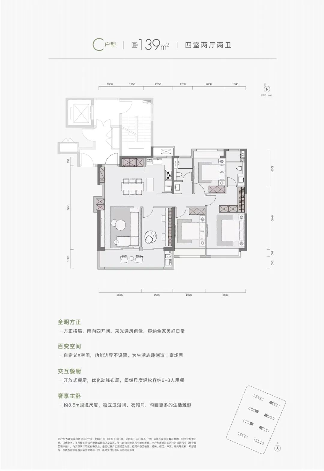 建面约135㎡四房两厅两卫户型:四开间朝南,L型厨房设计,北向带飘窗,整个户型南北通透。