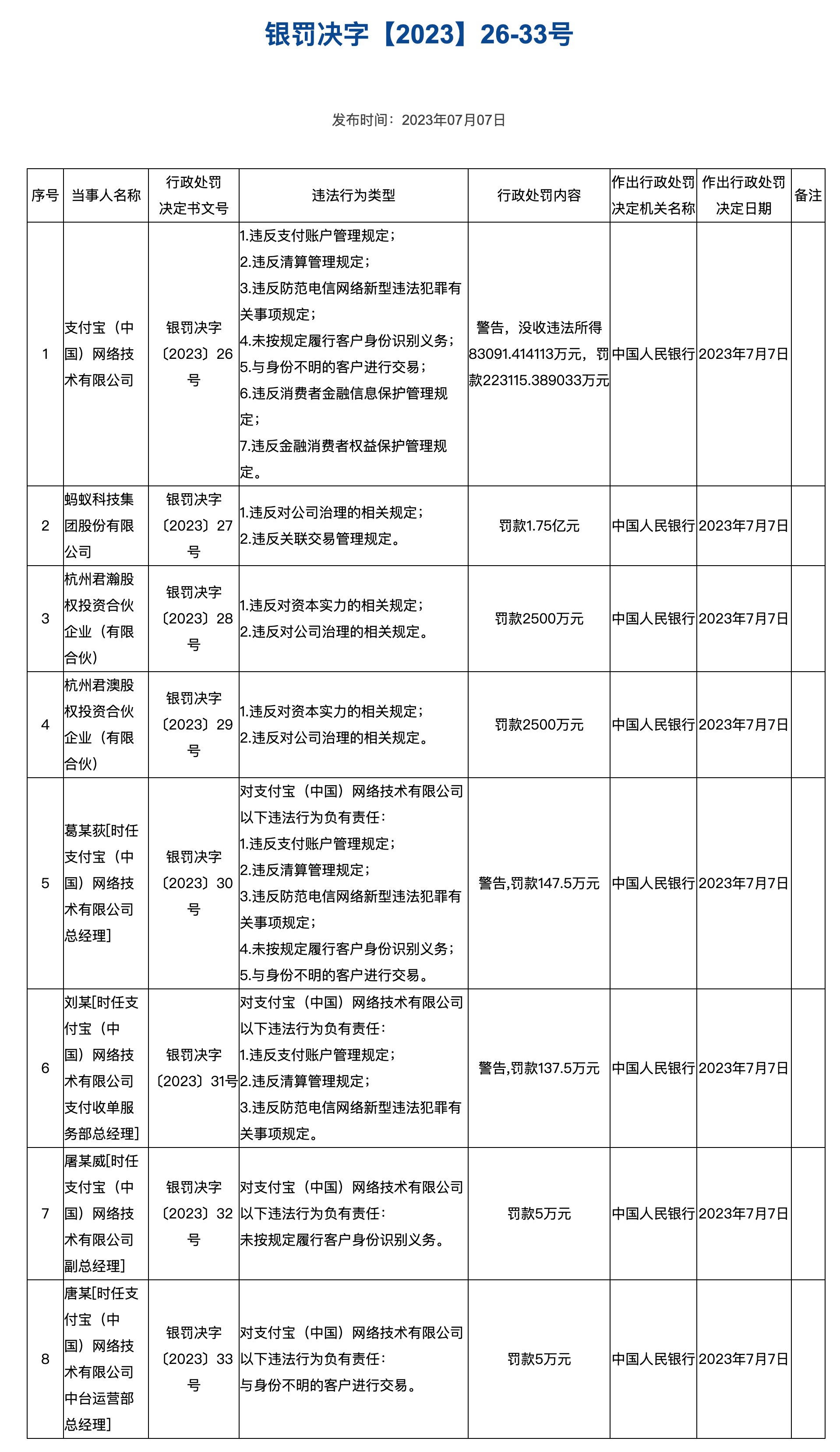 时任支付宝(中国)网络技术有限公司总经理葛某荻被罚款147.5万元;时任支付宝(中国)网络技术有限公司支付收单服务部总经理刘某被罚款137.5万元;时任支付宝(中国)网络技术有限公司副总经理屠某威被罚款5万元;时任支付宝(中国)网络技术有限公司中台运营部总经理唐某被罚款5万元。