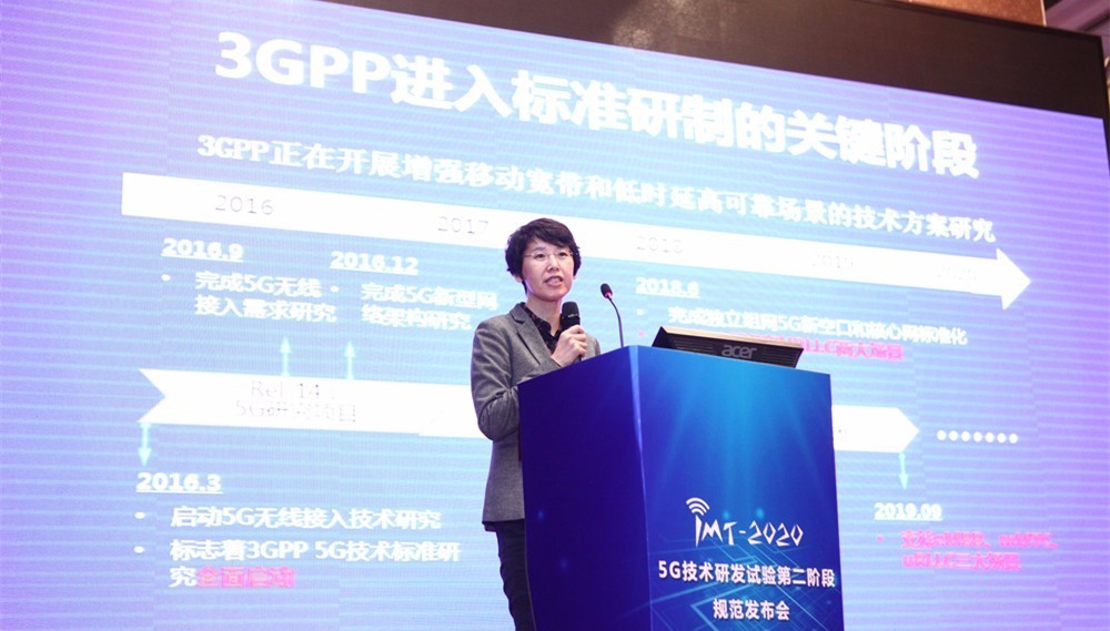 2016年11月20日,IMT-2020(5G)推进组在北京召开5G技术研发试验第二阶段技术规范发布会,来自国内外主要移动运营企业、系统设备、芯片、终端和仪表企业的100余名代表参加了会议。工信部、发改委和科技部相关领导出席了会议。图为IMT-2020(5G)推进组副组长王晓云发布第二阶段测试规范。