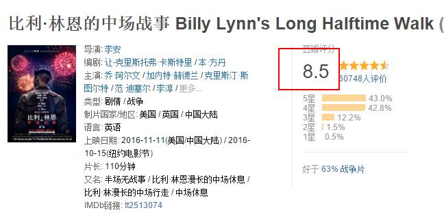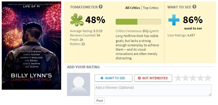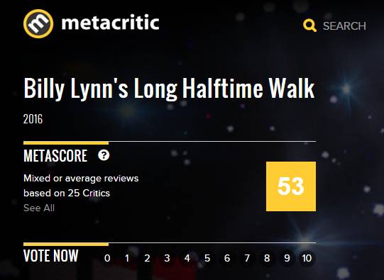 李安的新片《比利·林恩》一个月前就在北美上映了,外国人好像不喜欢,各影评网站一致差评。