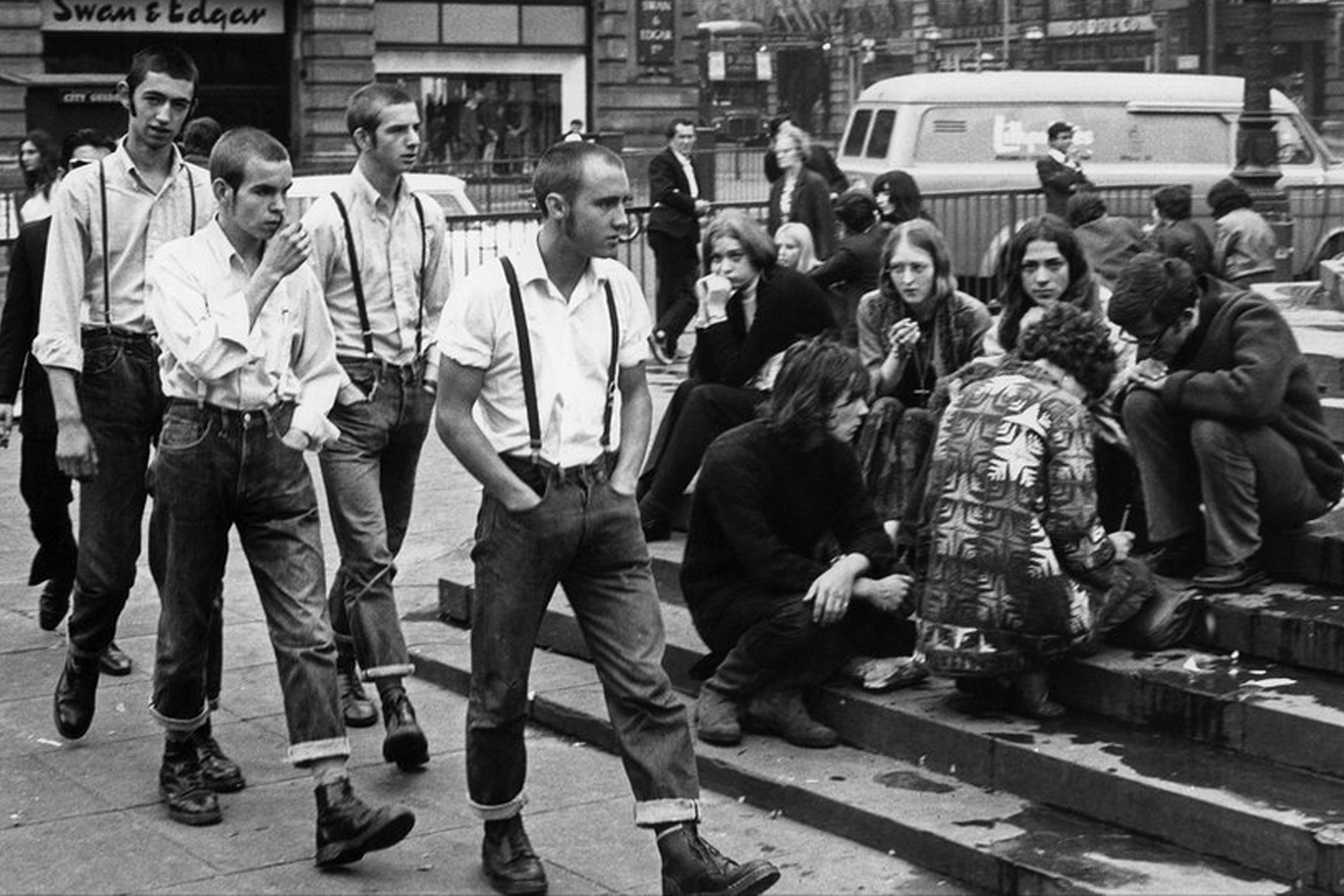 随后在1959年,英国鞋业制造商R.Griggs集团买下Dr.Martens的专利权,使其正式成为英国品牌。马丁靴实用、简便,是工厂工人常穿的款式,与上流社会推崇的皮鞋形成对立。当青年摇滚文化开始兴盛,马丁靴也找到了它在流行文化中的立足点。
