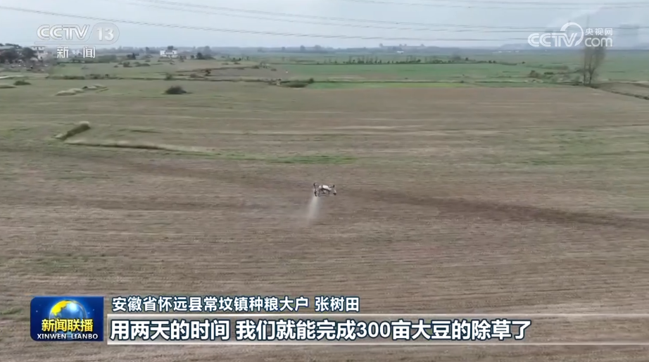 今年,皖北大豆主产区持续推进单产提升行动。在安徽怀远县种粮大户张树田的300亩大豆田里,无人机、植保机正在除草。由于夏播时全部采用大豆根瘤菌拌种,豆苗出得更齐、更壮。