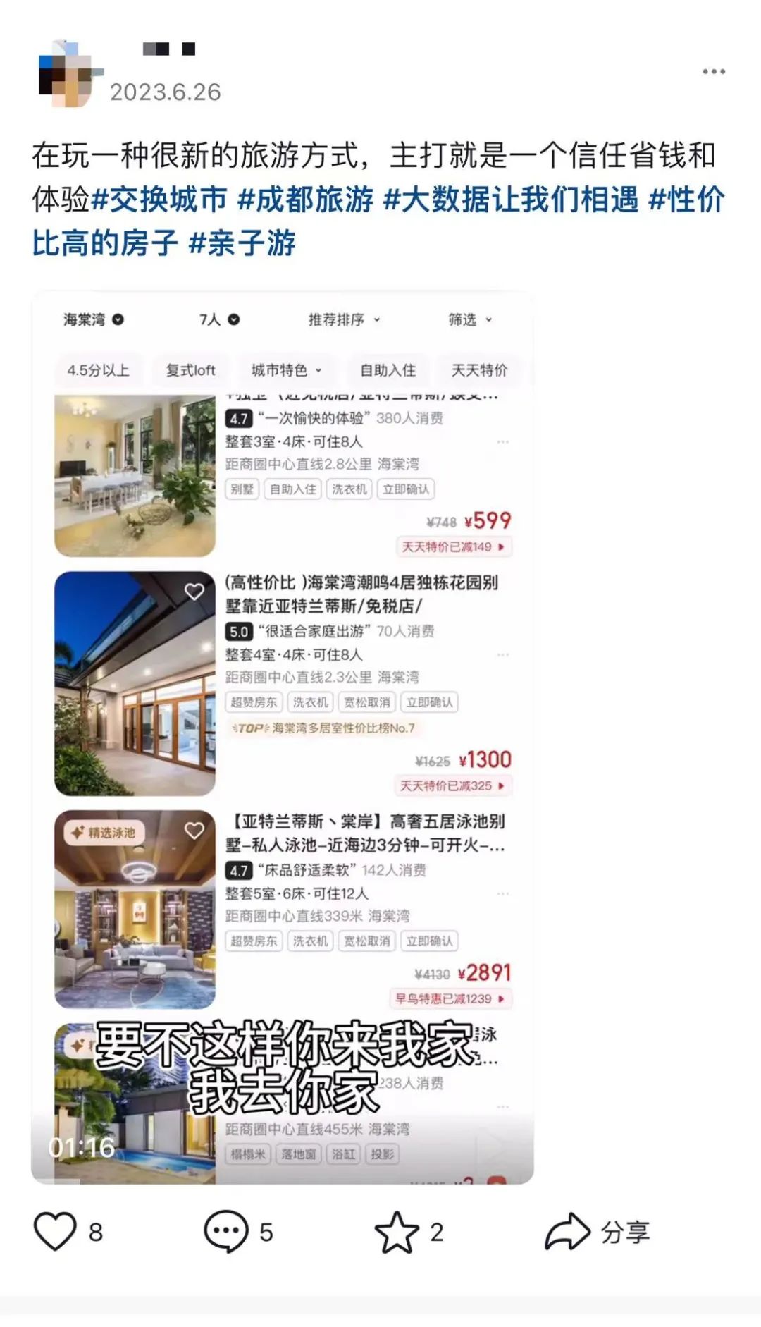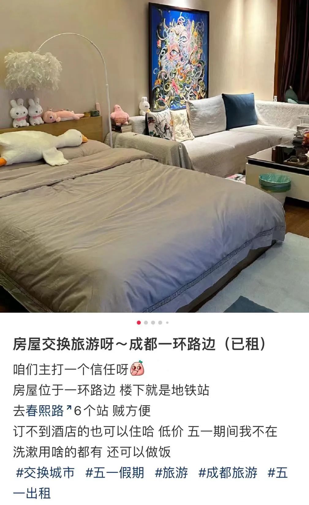 无独有偶,社交平台上由网友发起的交换游背后隐藏着更多“雷区”。有的网友晒出自家房间照片后,从单个房间到整套房明码标价,俨然变成了另一种形式的“民宿”。