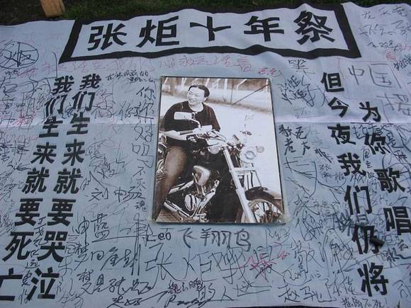 在张炬的葬礼上,姜昕把他称之为“中国摇滚乐群体的最集中展示”,在摇滚圈里能来的都来了,现场没有一朵纸花,没有黑白的挽,他们用最灿烂的方式为张炬送行。