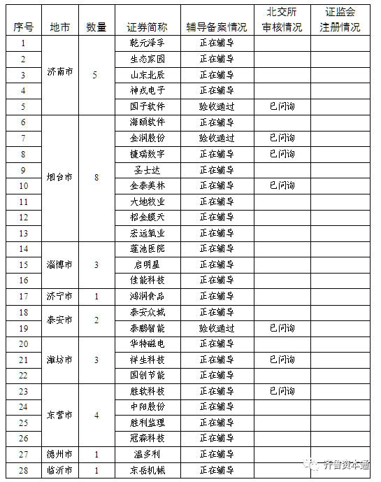 7月11日,山东省公众公司协会发布消息称,截至6月底,辖区(不包括青岛)共有28家新三板公司拟申请公开发行并在北交所上市,其中,济南5家,烟台8家,淄博3家,泰安2家,东营4家,潍坊3家,临沂、济宁、德州各1家。