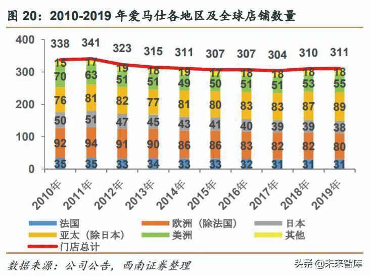 图2 2020-2019年爱马仕区域市场,以及全球店铺数量