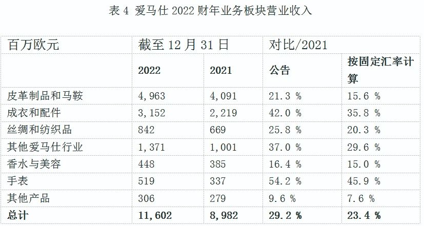表4 爱马仕2022财年业务板块营业收入