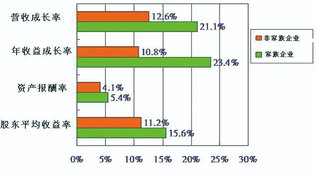 由此可见,家族企业经过多年的风雨洗礼,家族企业都发展和壮大了。公开数据显示,按10年平均值计算,家族企业股东平均年收益为15.6%,比非家族企业股东平均年收益11.2%高出4.4%;在资产报酬率上,家族企业为5.4%,而非家族企业为4.1%;在公司年收益成长方面,家族企业为23.4%,非家族企业仅有10.8%;比较公司年营业额增长率,家族企业有21.1%,而非家族企业则有12.6%相差8.5%,见图3。