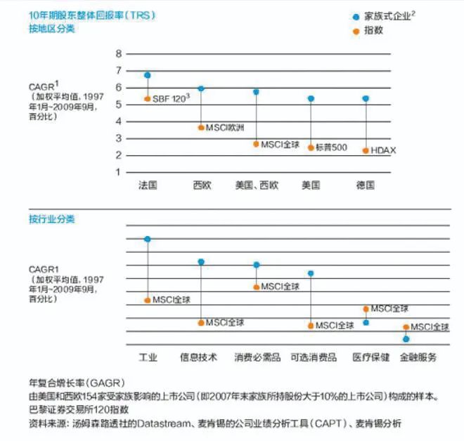 数据显示,从1997年到2009年之间,针对美国和西欧上市家族式企业计算的“广基指数”所实现的股东整体回报率,比 MSCI 全球、标普500以及 MSCI 欧洲指数要高出2%~3%(新营销,2010),见图5。