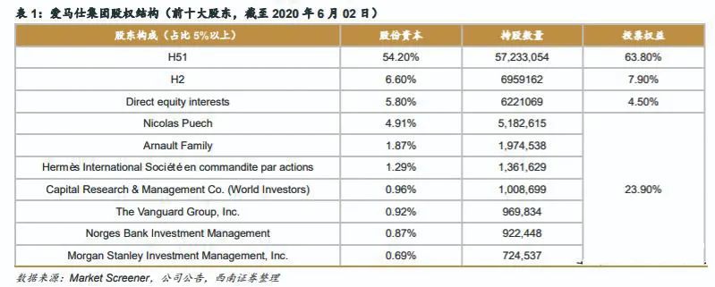 表7 截至2020年6月2日爱马仕股权结构(前十大股东)