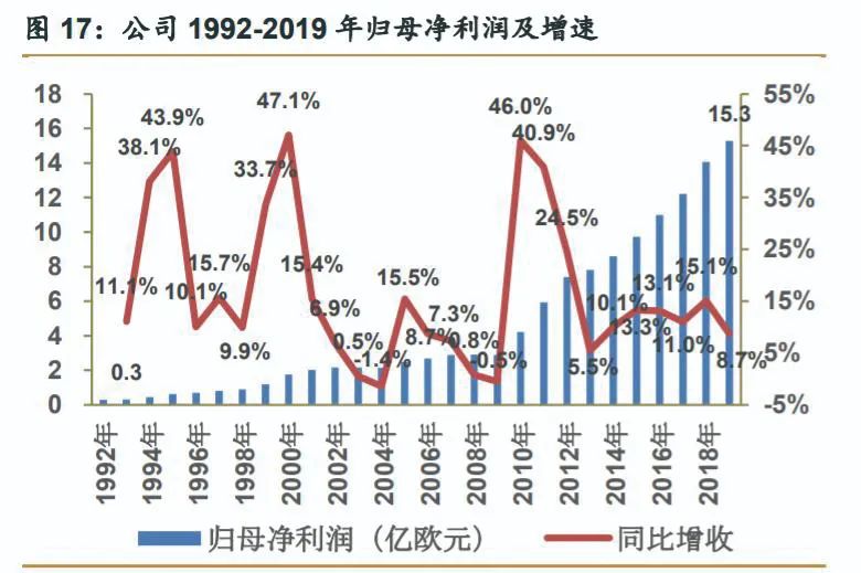 爱马仕2019年实现归母净利润15.3亿欧元,是1993年上市时0.3亿欧元净利润的51倍,接近30年维持在16%以上的符合增长率,超过营收的年复合增长率(未来智库,2020),见图6。