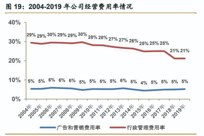 在费用方面,爱马仕在广告和营销方面的费用情况多年来处于稳定的低值,该项费用在销售额中的占比仅为5%~6%。行政管理费用率在2004~2009年为29%~30%,从2010年开始,爱马仕提升管理能力,这一部分的支出得到优化,整体处于下降趋势,在2018和2019年,行政费用率降低到21%(未来智库,2020),见图7。