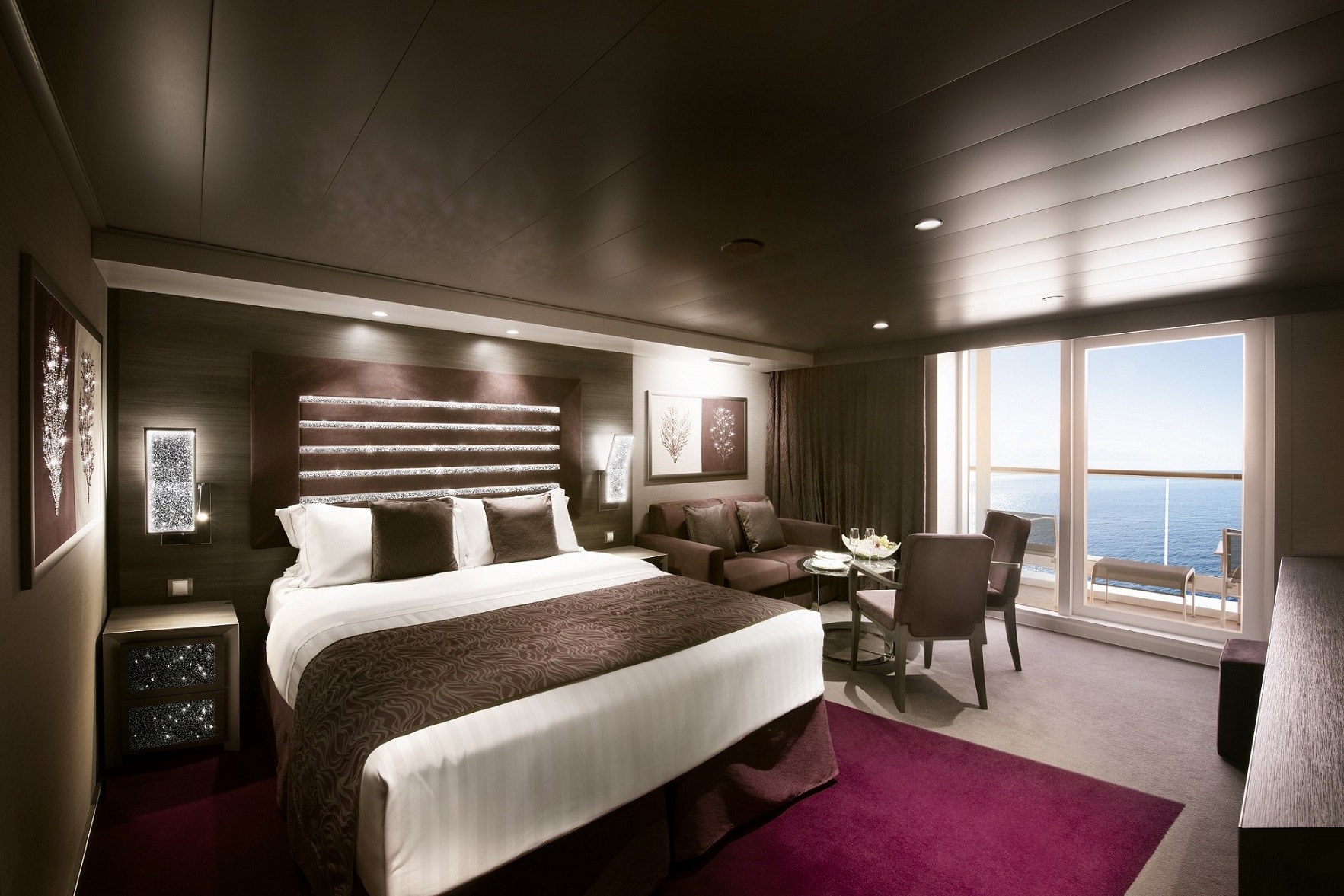 MSC荣耀号上共配备有2217间高品质舱房,其中包括可供多达10人入住、适合多代大家庭的超级家庭房以及带有专属露台和漩涡泳池的复式套房。MSC荣耀号上还推出海上首个施华洛世奇水晶套房,套房内共镶嵌70万颗水晶。