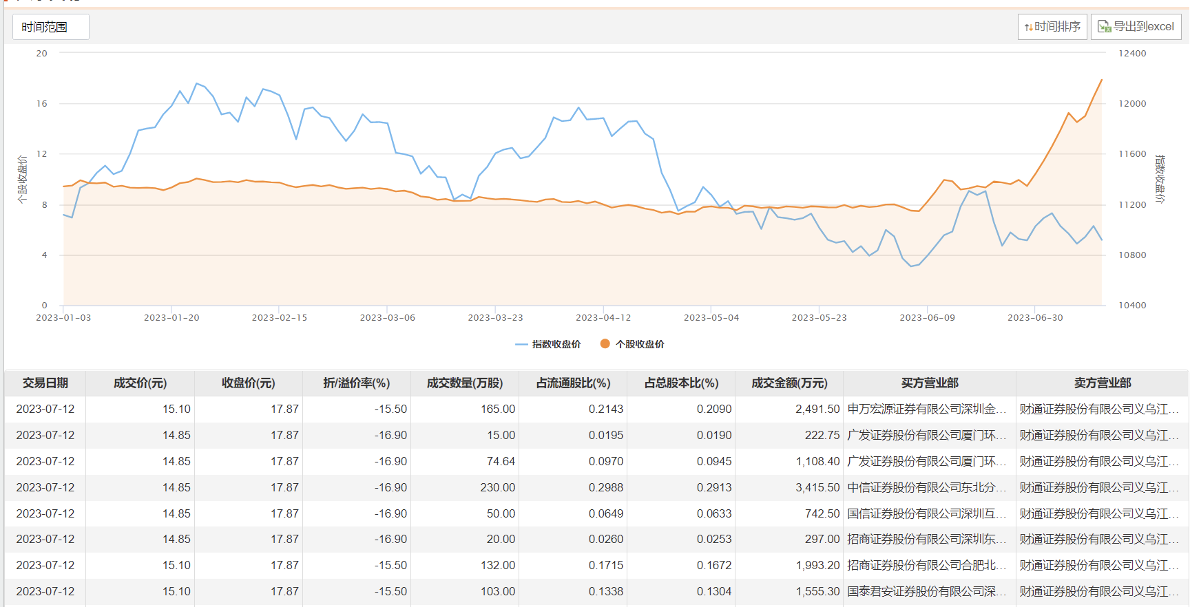 浙江世宝7月12日大宗交易成交789.64万股,成交额1.18亿元,占当日总成交额的3.46%,成交均价14.98元,较市场收盘价17.87元折价16.17%,其中最高成交价15.1元,最低成交价14.85元。