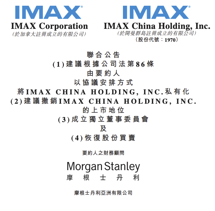 7月13日早间,IMAX CHINA在港交所公告,于2023年7月13日,要约人(IMAX Corporation)就建议根据公司法第86条以协议安排方式将公司私有化,请求董事会向计划股东提呈建议。