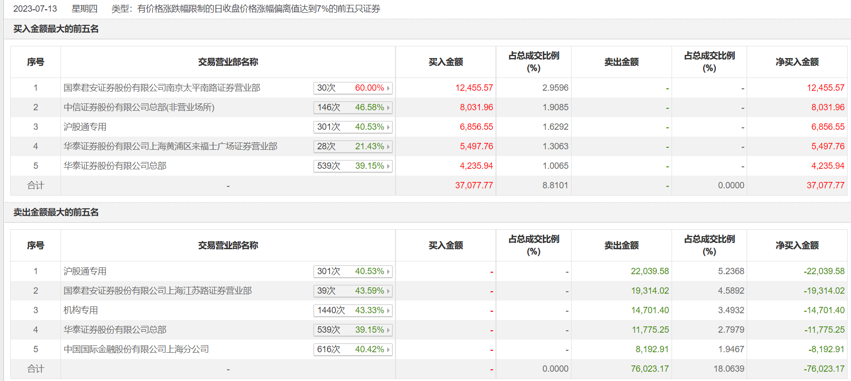 人民网今日涨停,龙虎榜数据显示,上榜营业部席位全天成交11.31亿元,占当日总成交金额比例为26.87%。其中,买入金额为3.71亿元,卖出金额为7.6亿元,合计净卖出3.89亿元。