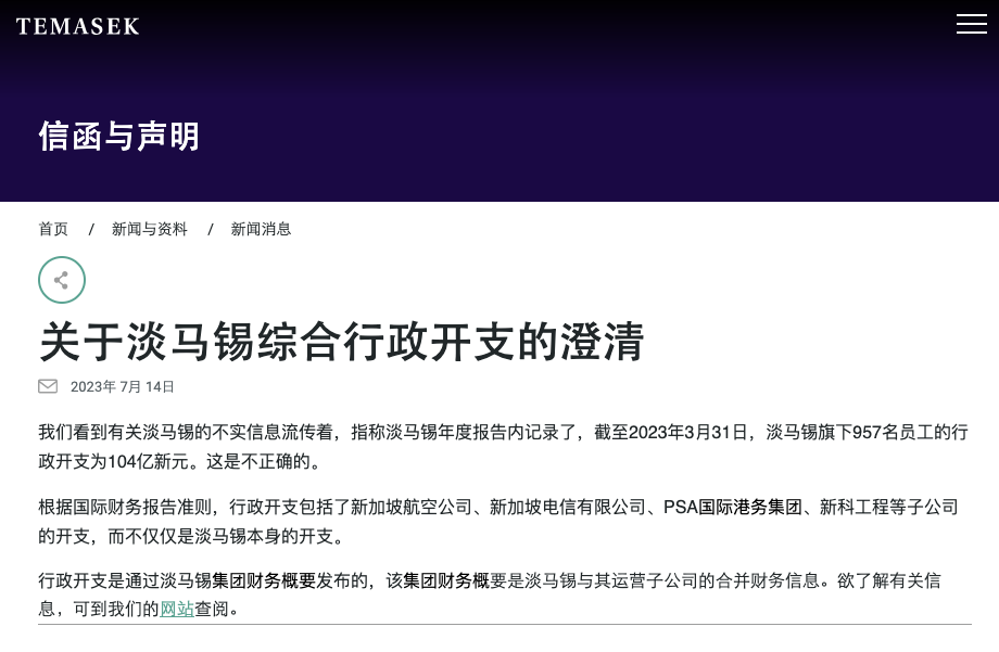 7月14日,淡马锡官网发布澄清声明称,“我们看到有关淡马锡的不实信息流传着,指称淡马锡年度报告内记录了,截至2023年3月31日,淡马锡旗下957名员工的行政开支为104亿新元。这是不正确的。”淡马锡称,根据国际财务报告准则,行政开支包括了新加坡航空公司、新加坡电信有限公司、PSA国际港务集团、新科工程等子公司的开支,而不仅仅是淡马锡本身的开支。