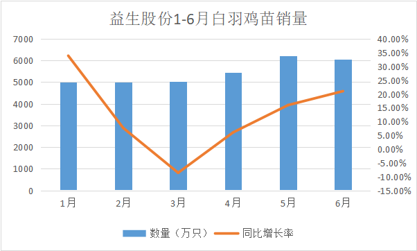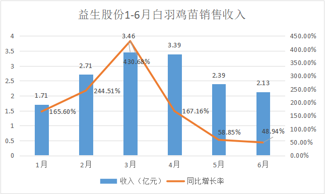 益生股份数据统计,公司2023年1-6月白羽鸡苗累计销售收入达15.79亿元。受白羽鸡苗价格波动影响,3月白羽鸡苗销售收入达到最高点,最高涨幅超430.68%。
