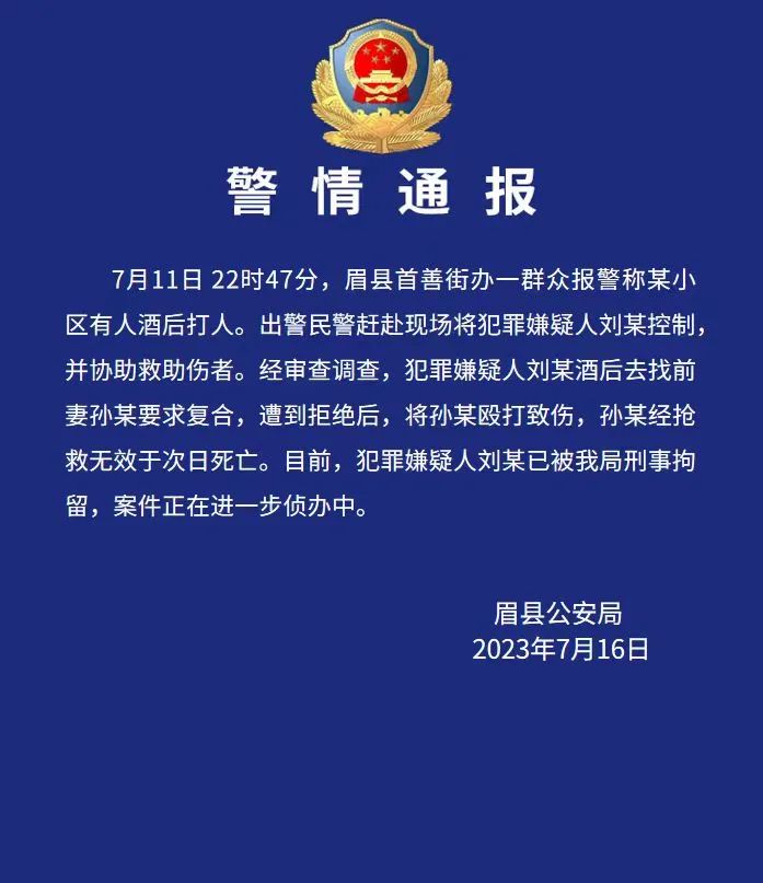 眉县公安微信公众号7月16日发布警情通报:7月11日22时47分,眉县首善街办一群众报警称某小区有人酒后打人。出警民警赶赴现场将犯罪嫌疑人刘某控制,并协助救助伤者。经审查调查,犯罪嫌疑人刘某酒后去找前妻孙某要求复合,遭到拒绝后,将孙某殴打致伤,孙某经抢救无效于次日死亡。目前,犯罪嫌疑人刘某已被我局刑事拘留,案件正在进一步侦办中。