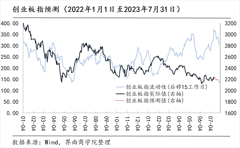 上图中,深蓝色实线为创业板指各交易日实际值,红色虚线为创业板指预测值。测算结果显示,7月下半月(7月16日至7月31日)预测区间内,创业板指指数仍存在下行空间。不过,当前流动性指数与实际指数走势偏离幅度较大,依照历史走势分析,指数回归将呈现为两者缺口收缩,创业板指亦存在向上动能,故不宜过度悲观。