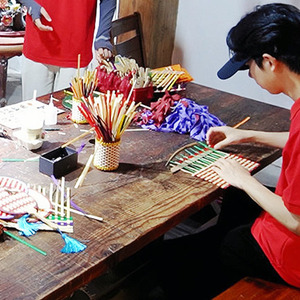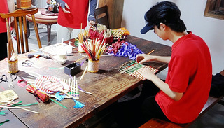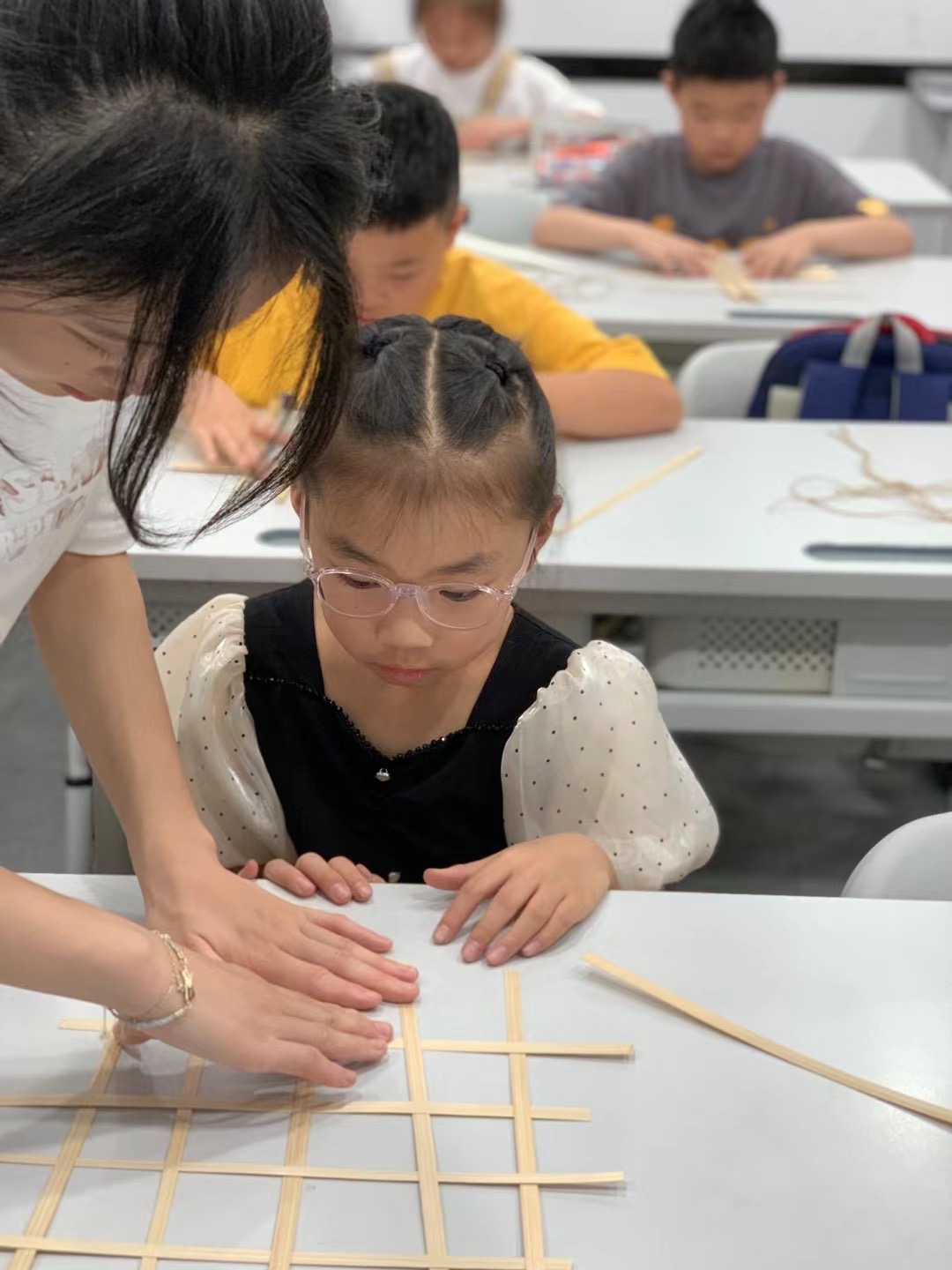 而经过一番讲解,孩子们也都跃跃欲试,实践团的同学们便开始教孩子们做起了竹编。一挑一压,竹条在孩子们的指尖交互缠绕,通过大学生们的手把手的教学和小朋友们的耐心制作,一件件精美的工艺品逐渐在孩子们的手中成型。