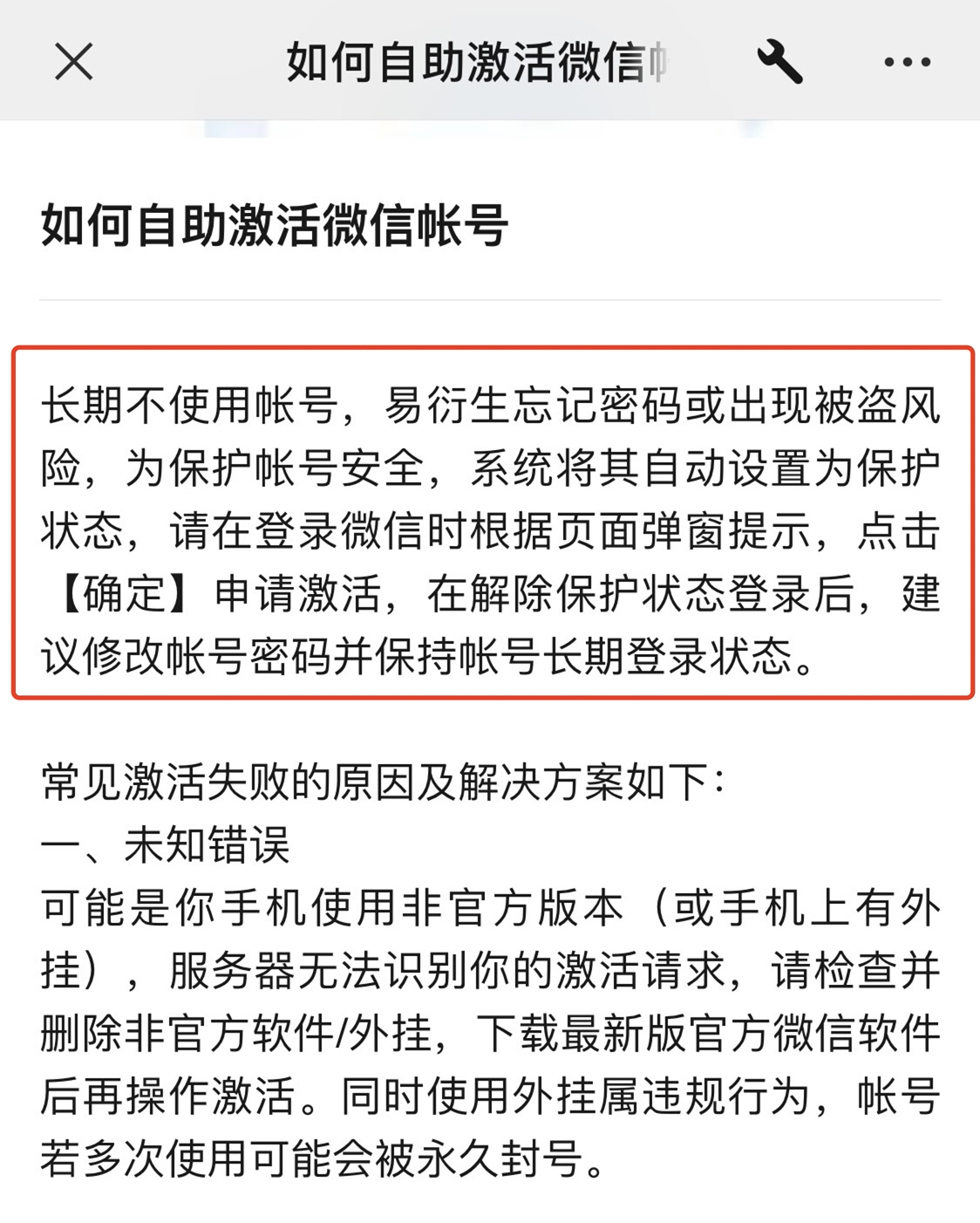 事实上,如果一定时间内不登录微信,还可能触发一种情况:微信号保护状态。根据微信帮助文档,长期不使用账号易衍生忘记密码或出现被盗风险,为保护账户安全,系统将自动设置为保护模式。在保护状态下,用户可以通过好友手机号等方法进行辅助激活。