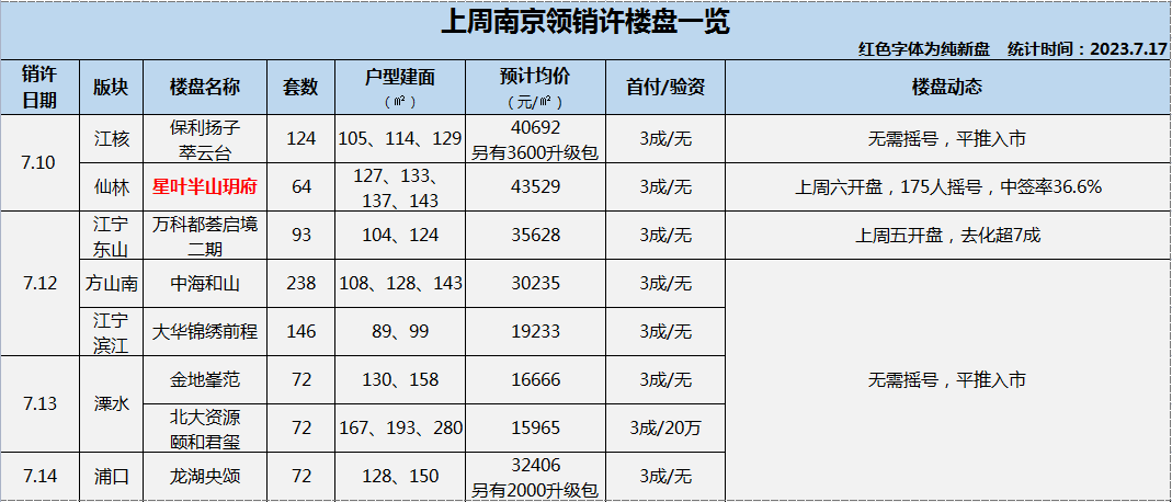 据南京网上房地产显示,上周(7月10日-7月14日)南京共有8家楼盘共881套房源领取销许,其中仅仙林的星叶半山玥府项目是纯新盘,并且仅半山玥府项目需摇号入市,其它7盘均无需摇号,平推入市。