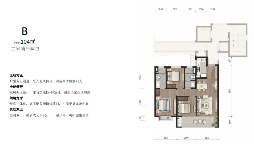 以143㎡玥尚来看,四房两厅户型设计方正,四室两厅两卫,南北通透,动静分离, LDKB一体化。主、次卧+客厅三开间南向,最大程度上保证日常居住的采光需求。贯穿次卧及客厅的超大阳台,给家庭生活空间保留更多的选择性。