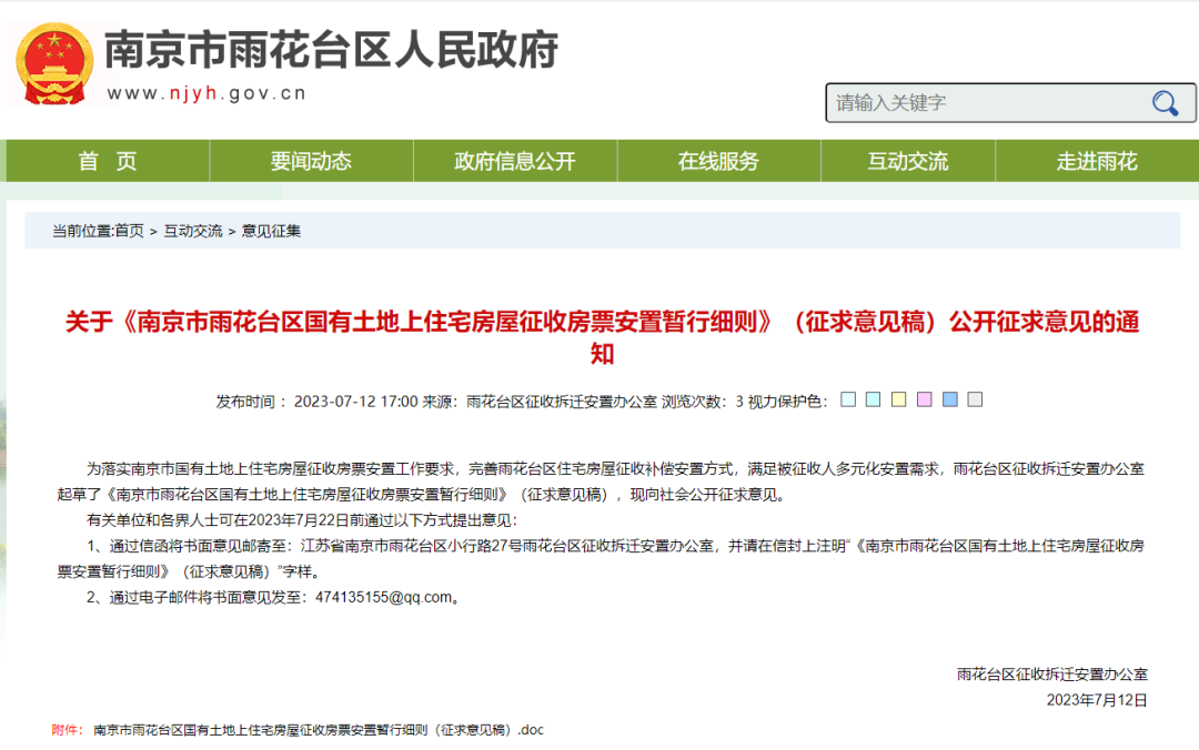 上周三(7月12日),雨花人民政府官网发布关于《南京市雨花台区国有土地上住宅房屋征收房票安置暂行细则》(征求意见稿)公开征求意见的通知,细则适用于2023年4月18日至2025年4月17日期间作出征收决定的项目。