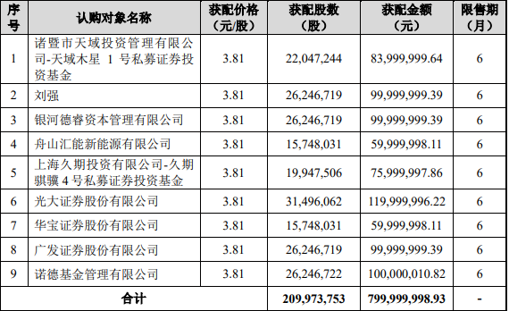 本次认购对象包括诸暨市天域投资管理有限公司-天域木星1号私募证券投资基金,银河德睿资本管理有限公司等。其中诸暨市天域投资管理有限公司-天域木星1号私募证券投资基金获配金额8400万元,银河德睿资本管理有限公司获配金额为1亿元。