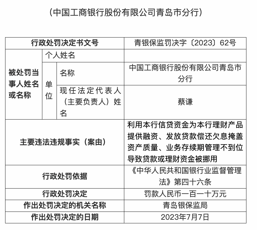 7月17日,国家金融监督管理总局公布的行政处罚信息公开表显示,2023年7月7日,中国工商银行股份有限公司青岛市分行因利用本行信贷资金为本行理财产品提供融资、发放贷款偿还欠息掩盖资产质量、业务存续期管理不到位导致贷款或理财资金被挪用,被处罚款人民币110万元。