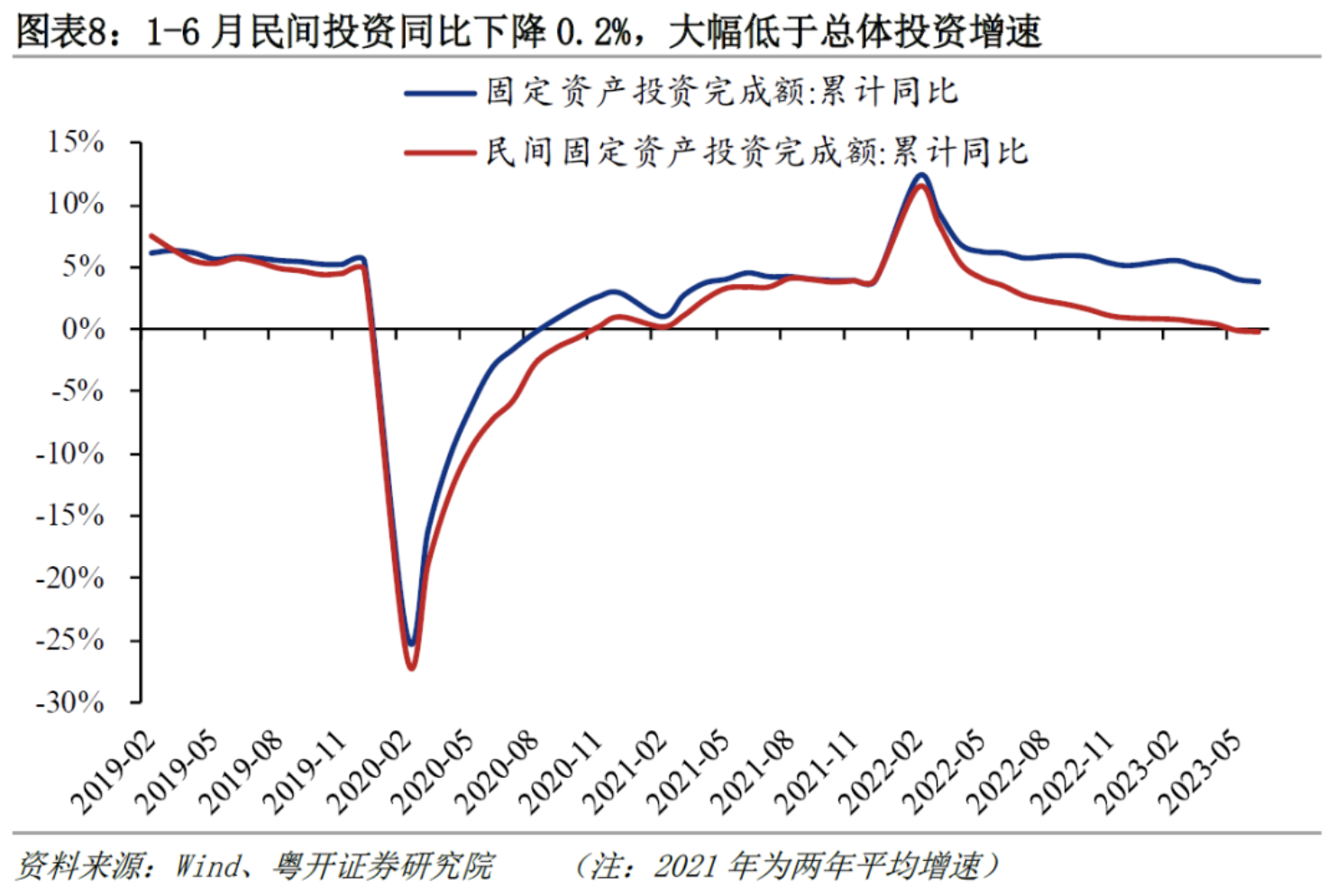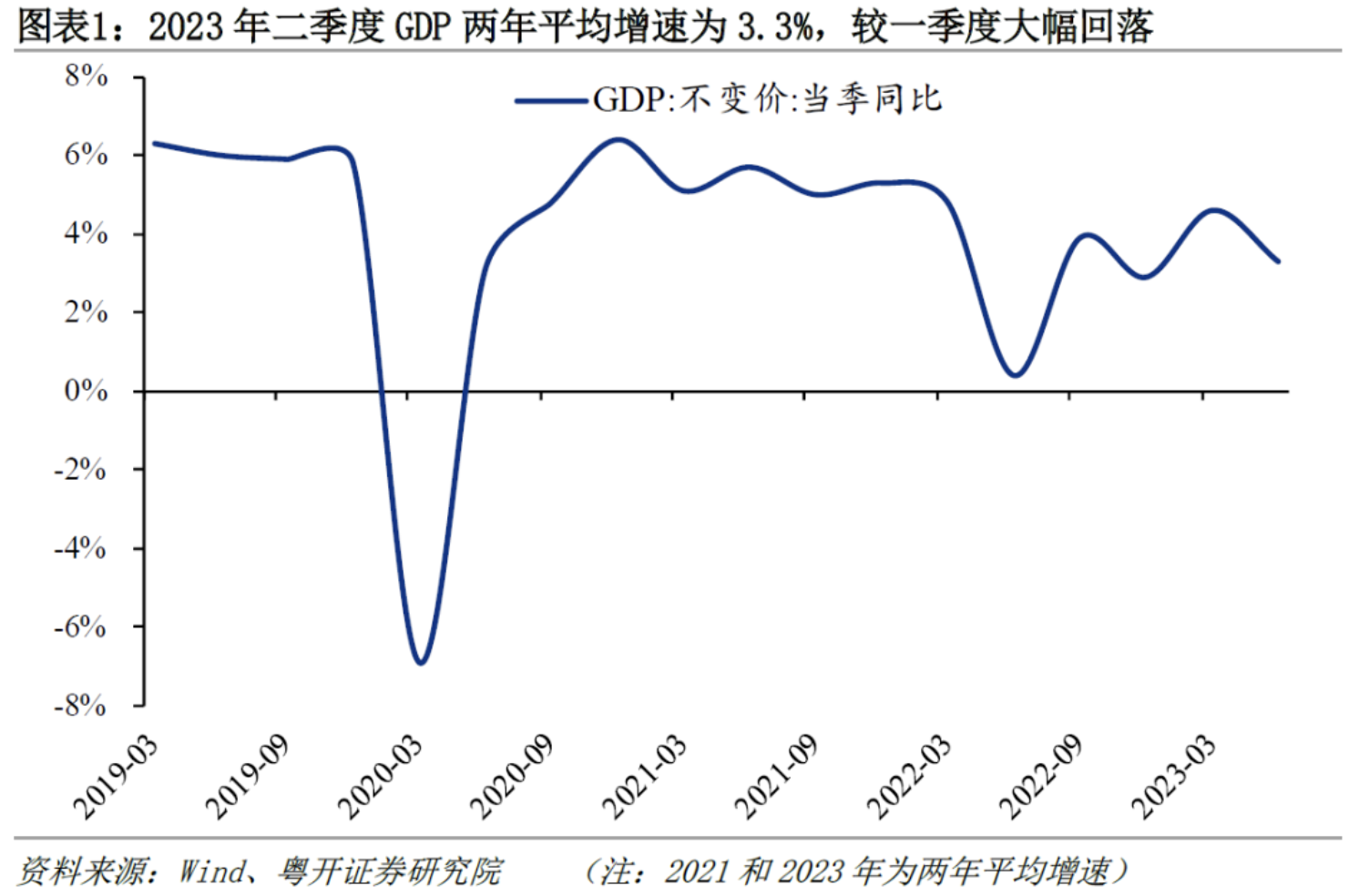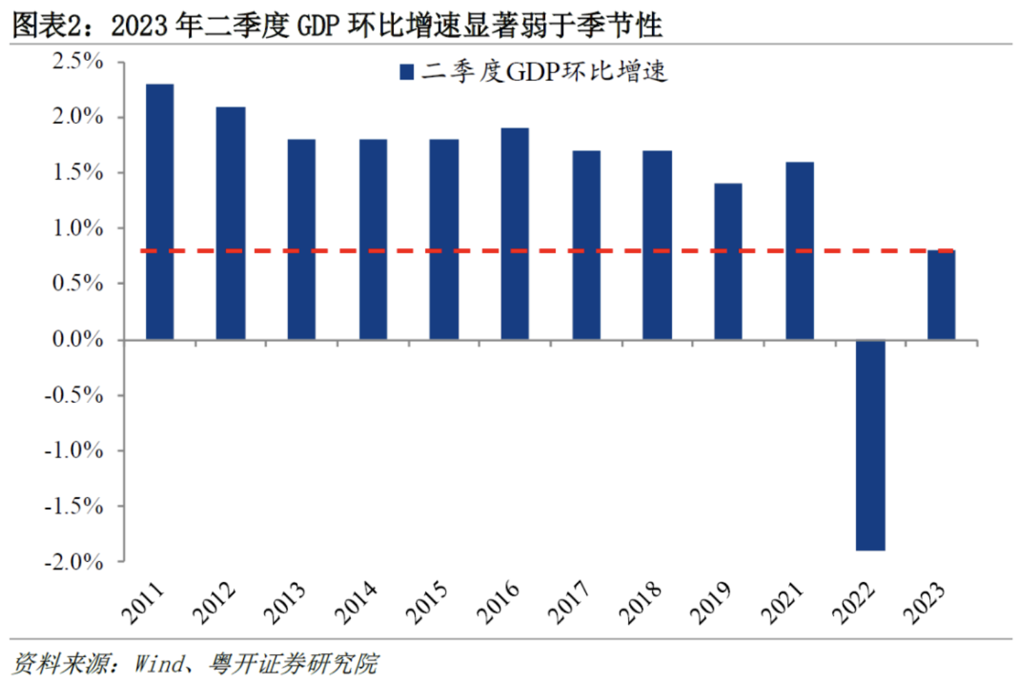 二季度GDP同比增长6.3%,低于市场预期的6.8%;两年平均增速为3.3%,较一季度的4.6%大幅回落,经济从一季度疫情平稳转段、积压需求集中释放后回归修复之路。经济运行显著弱于季节性,二季度GDP环比增速仅为0.8%,是除疫情冲击之下的2022年同期以外的最低值,2011-2019年同期的增速区间为1.4%-2.3%。
